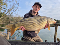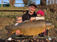 Další den, opět až když se sluníčko prodralo mlhou, dostáváme další pomalý záběr. Ryba moc nebojovala, jen se převalovala a já tušil že by to mohla být hezká ryba. A byla! 19,2kg těžký šupináč nám udělal opravdu velkou radost. A jak jinak než z toho jednoho místa na 14mm peletu chilly fishky.